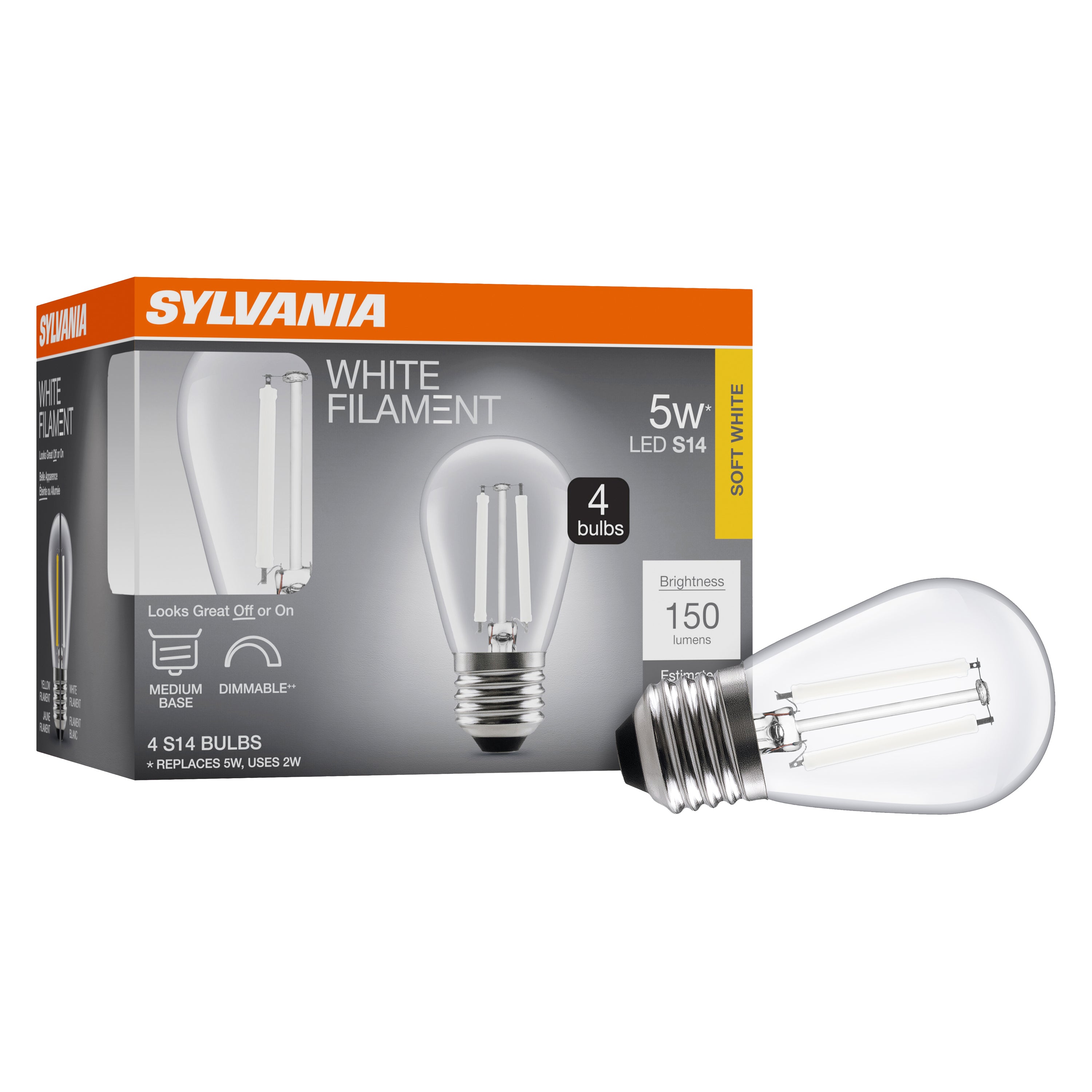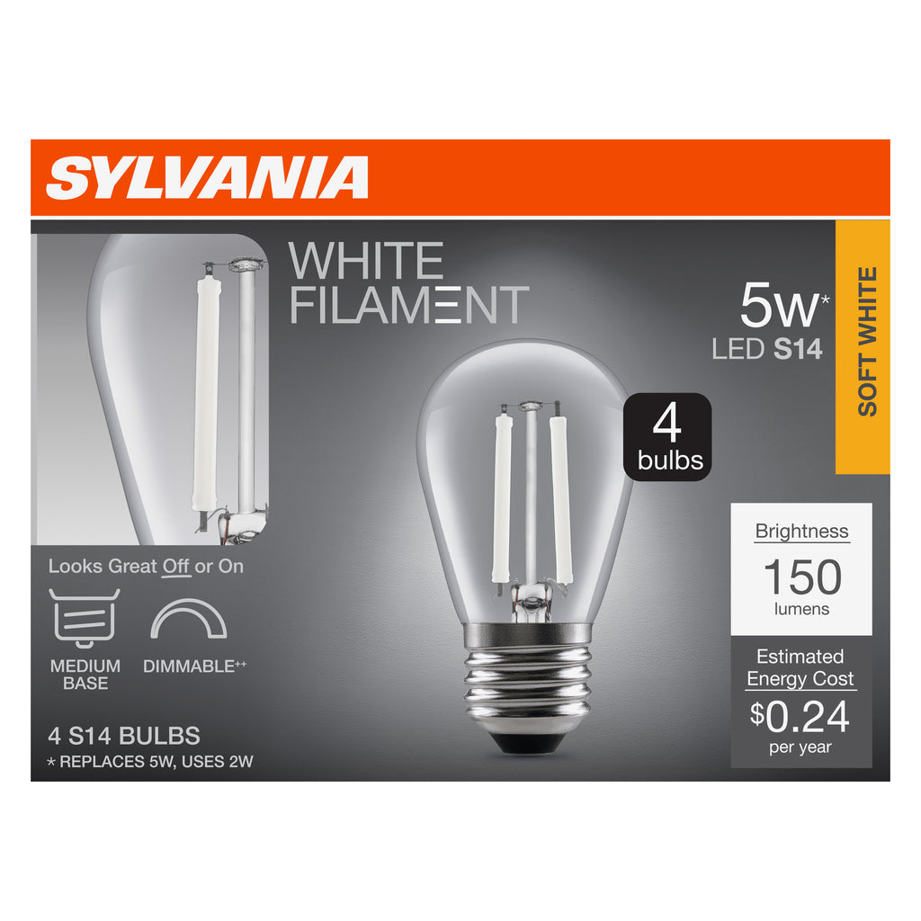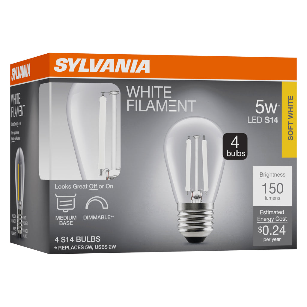 SYLVANIA S14 Clear LED White Filament Bulb, 2W, Dimmable, 150 Lms, Medium Base, 2700K, Soft White - 4 PK