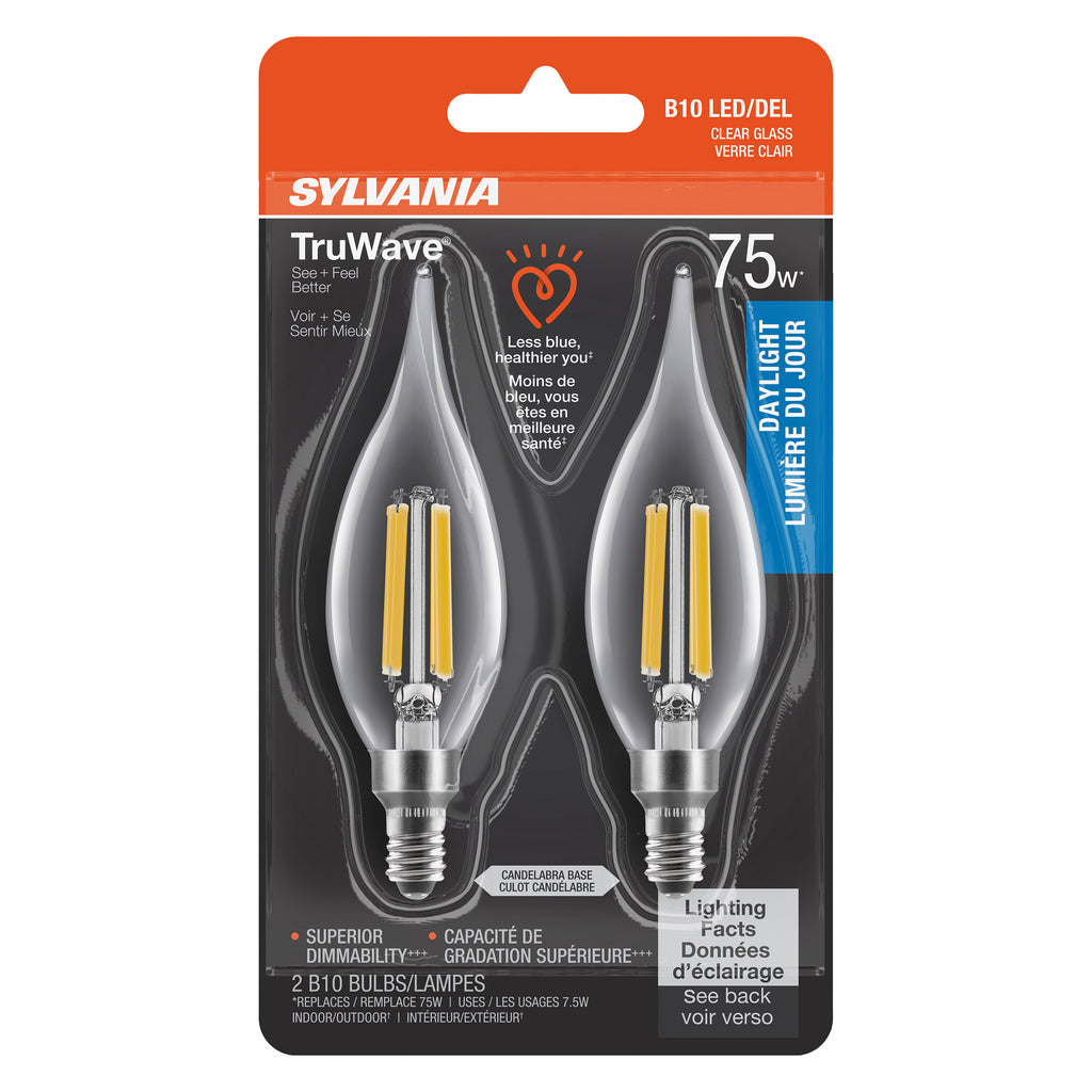 SYLVANIA LED TruWave Décor Light Bulb, B10 Chandelier 75W = 7.5W, Candelabra Base, Dimmable, 750 Lumens, 5000K, Clear, Daylight - 2 PK