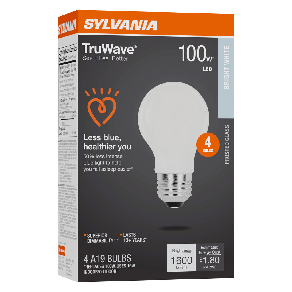 SYLVANIA LED TruWave A19 Light Bulb, 100W = 15W, 1600 Lumens, Medium Base, Dimmable, Frosted, 3500K, Bright White