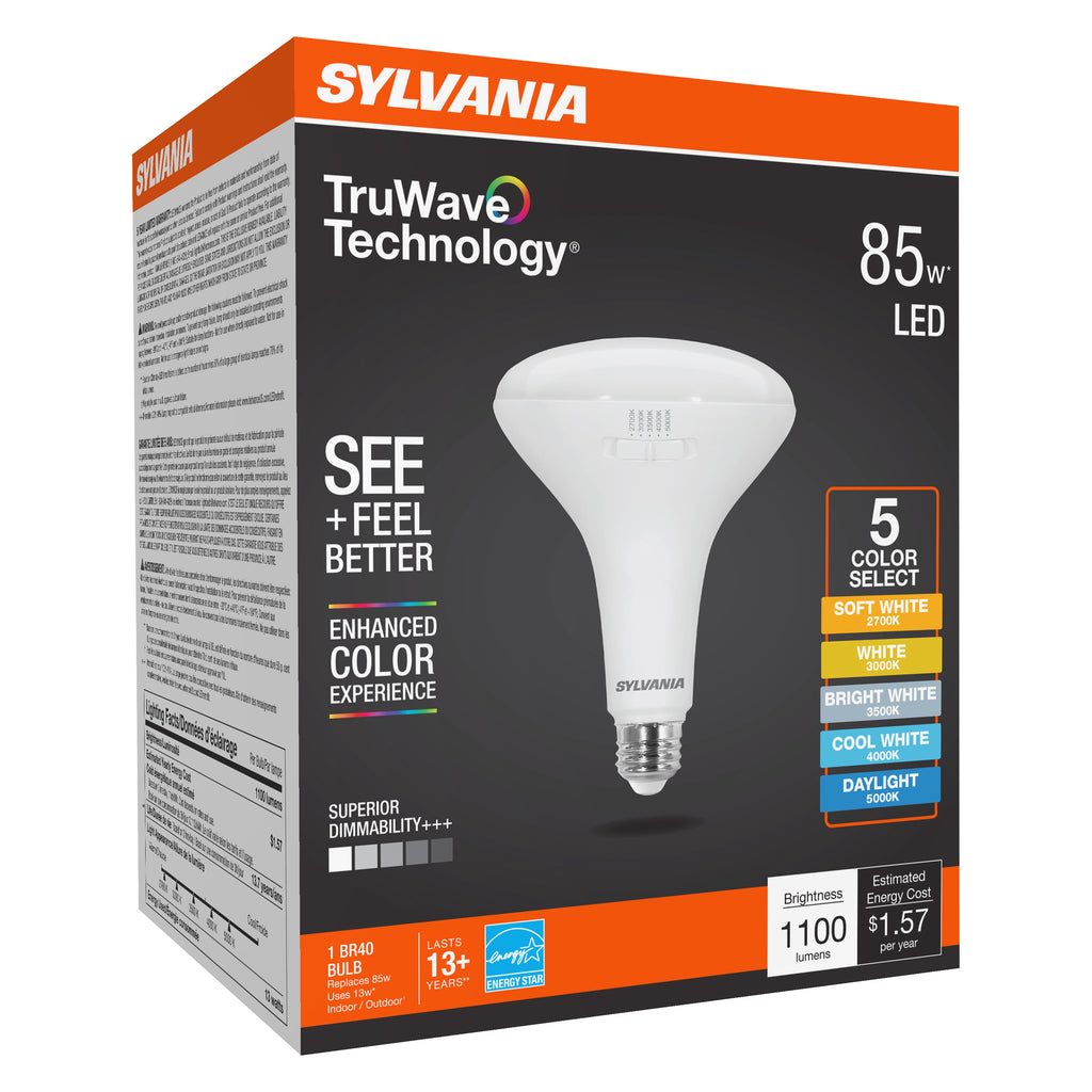 Make your home a place of comfort with SYLVANIA LED lighting with TruWave Technology. These long-lasting, energy-efficient, innovative LED lights deliver better eye soothing light that minimizes unnecessary blue light. SYLVANIA TruWave CCT Selectable Lamps come in five different color temperature settings, letting you choose the best option to retrofit your space, all while utilizing TruWave technology. Feel better with lighting that can help you fall asleep easier and supports an improved sleep/wake cycle. See better with light that’s more soothing for your eyes when reading and shows real, vivid colors, whites and skin tones. TruWave Technology delivers light most like the natural light of the sun, which can help you feel and look your best. Look for the TruWave logo and see the difference over 100 years of innovation makes - only with SYLVANIA.