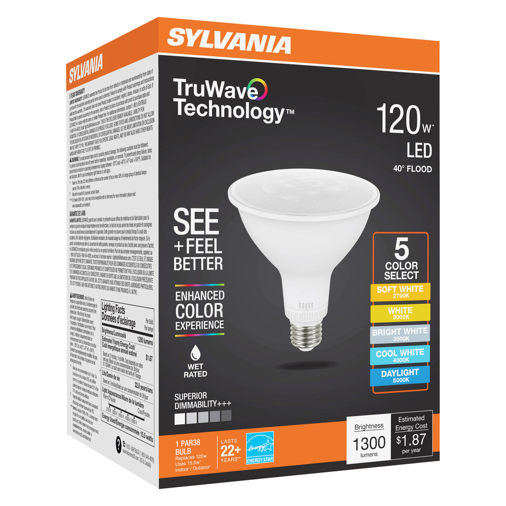 SYLVANIA TruWave PAR38 LED Light Bulb, 15.5W = 120W, 5 CCT Select 2700 / 3000 / 3500 / 4000 / 5000K, 40-Degree Angle, Dimmable, 1300 lms, Clear Finish