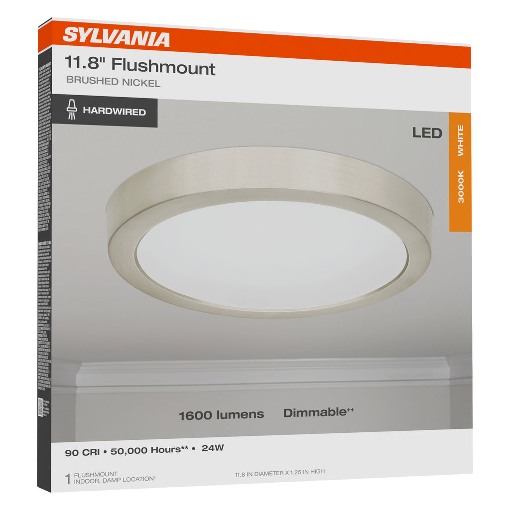 Brighten up your space with the modern simplicity and powerful performance of the SYLVANIA 12” Flush Mount LED Fixture. Whether you're setting the mood or lighting up your workspace, this sleek ceiling light offers warm white 3000K in color temperature. Built to Last: With an impressive 50,000-hour lifespan and a 3-year promise, this light fixture is a worry-free upgrade that shines on and on. Vivid Color Accuracy: With a 90 CRI, this fixture delivers rich, true-to-life color clarity in every room. Hardwired & Hassle-Free: Clean, flush-mount design with a durable finish for a seamless look in bedrooms, kitchens, hallways, and more. Damp Rated: Safe for indoor use in humid spaces like bathrooms or laundry rooms. Dimmable Comfort: Compatible with most dimmers for smooth lighting transitions, from energizing bright to soft and serene. Built to Last: With an impressive 50,000-hour lifespan and a 3-year promise.