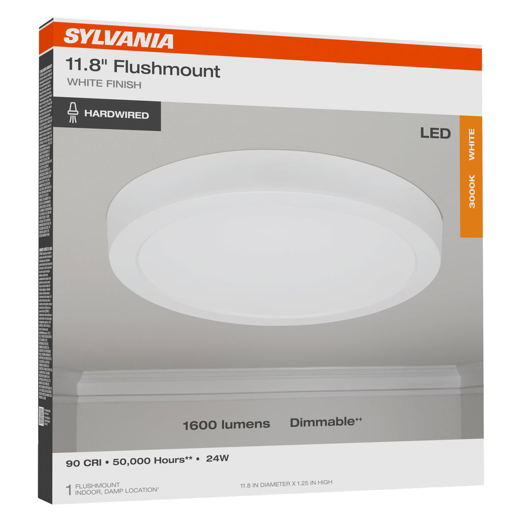 Brighten up your space with the modern simplicity and powerful performance of the SYLVANIA 12” Flush Mount LED Fixture. Whether you're setting the mood or lighting up your workspace, this sleek ceiling light offers warm white 3000K in color temperature. Built to Last: With an impressive 50,000-hour lifespan and a 3-year promise, this light fixture is a worry-free upgrade that shines on and on. Vivid Color Accuracy: With a 90 CRI, this fixture delivers rich, true-to-life color clarity in every room. Hardwired & Hassle-Free: Clean, flush-mount design with a durable finish for a seamless look in bedrooms, kitchens, hallways, and more. Damp Rated: Safe for indoor use in humid spaces like bathrooms or laundry rooms. Dimmable Comfort: Compatible with most dimmers for smooth lighting transitions, from energizing bright to soft and serene. Energy Smart: Consumes just 24 watts while delivering 1600 lumens — and costs only $2.89/year to operate.