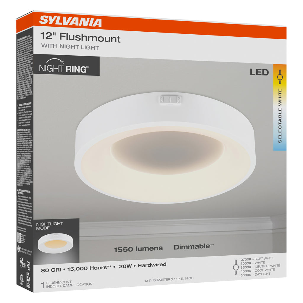 Upgrade your home lighting with the SYLVANIA 12" Flush Mount LED Fixture, designed to combine performance, efficiency, and style. Ideal for hallways, kitchens, foyers, bedrooms, and more, this sleek, low-profile ceiling light offers versatile functionality with a 2-function design—a bright outer ring for general illumination and a gentle night ring for subtle nighttime lighting. Designed in a metal frame with a white finish. See and feel the SYLVANIA difference—day or night. Customizable Color Temperature: Choose from 5 CCT options (2700K/3000K/3500K/4000K/5000K) to set the perfect ambiance for any time of day. Dual Light Output: The main light delivers a powerful 1550 lumens, while the center night ring offers a soft 50-lumen glow—perfect for late-night visibility. Energy Efficient & Cost Effective: Consuming only 20 watts, this LED fixture saves on energy with an estimated annual cost of just $2.41.