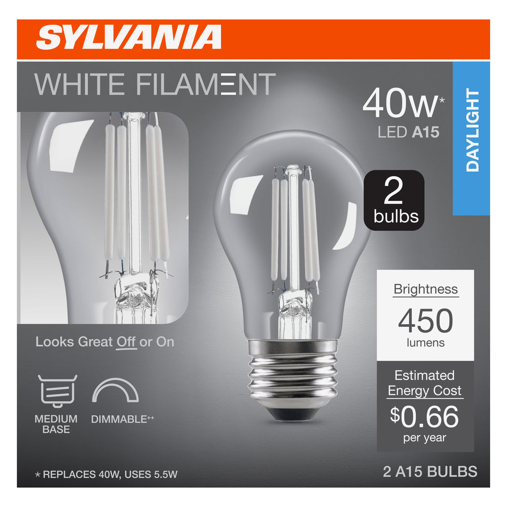 SYLVANIA A15 Clear Globe LED White Filament Bulb, 5.5W, Dimmable, 450 Lms, Medium Base, 5000K, Daylight - 2 PK