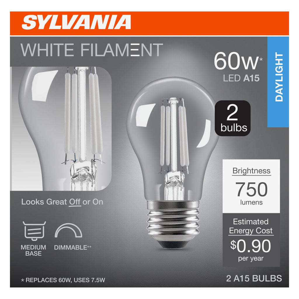 SYLVANIA A15 Clear Globe LED White Filament Bulb, 7.5W, Dimmable, 750 Lms, Medium Base, 5000K, Daylight - 2 PK