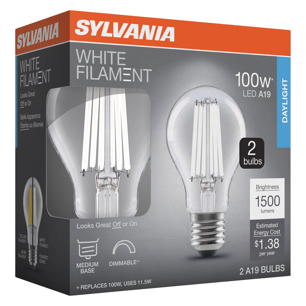 SYLVANIA A19 Clear LED White Filament Bulb, 11.5W, Dimmable, 1500 Lms, Medium Base, 5000K, Daylight