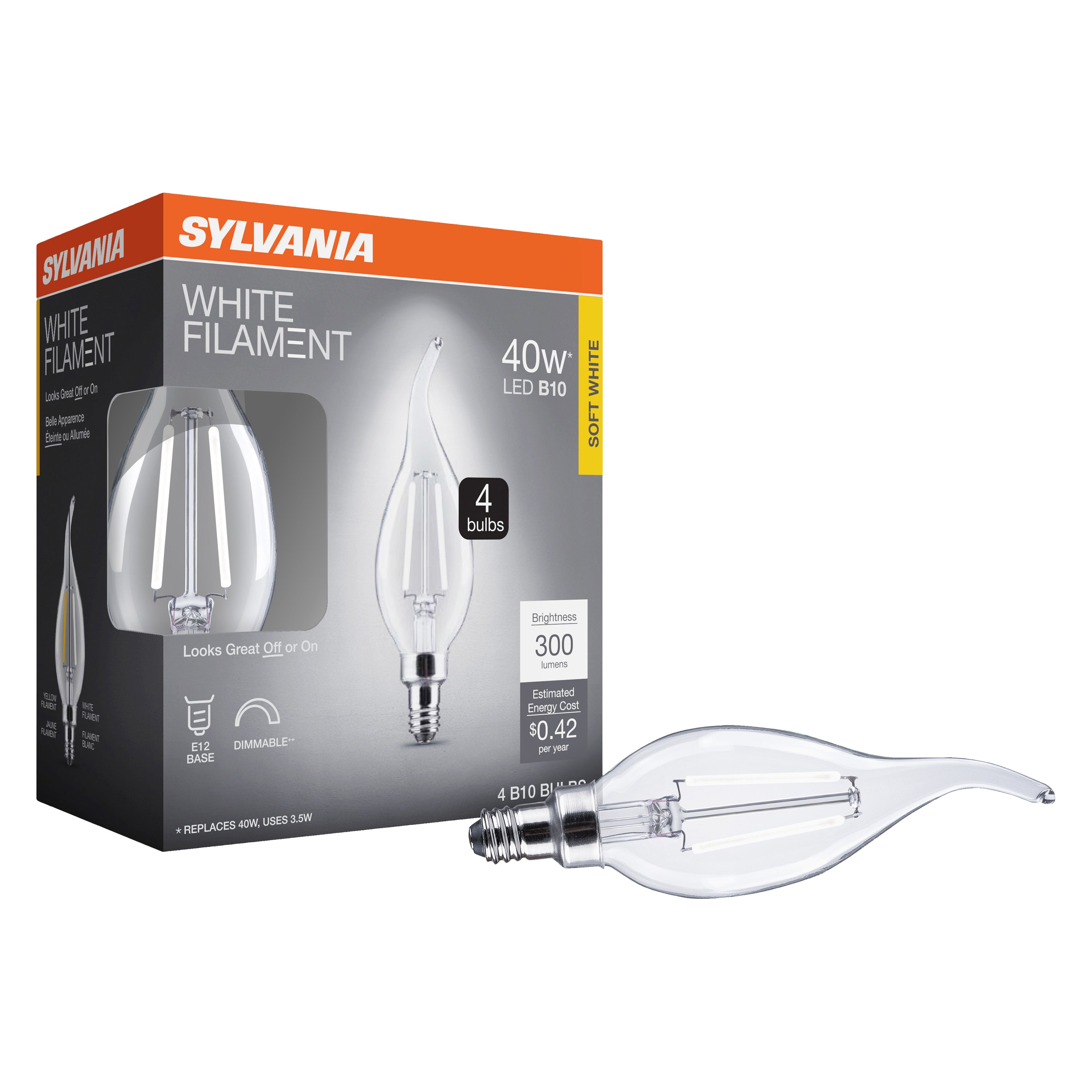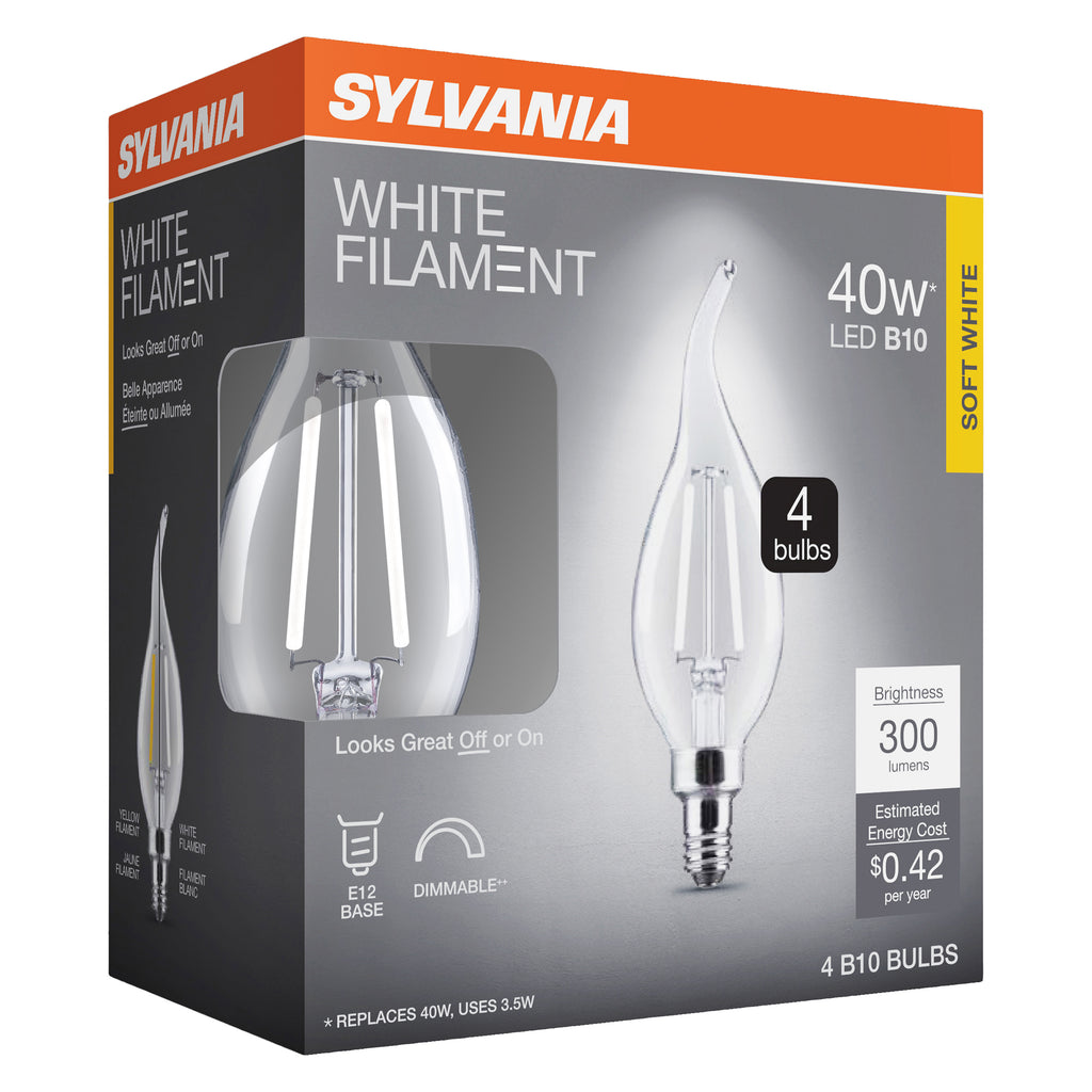 SYLVANIA B10 Clear LED White Filament Bulb, 3.5W, Dimmable, 300 Lms, Candelabra Base, 2700K, Soft White - 4 PK