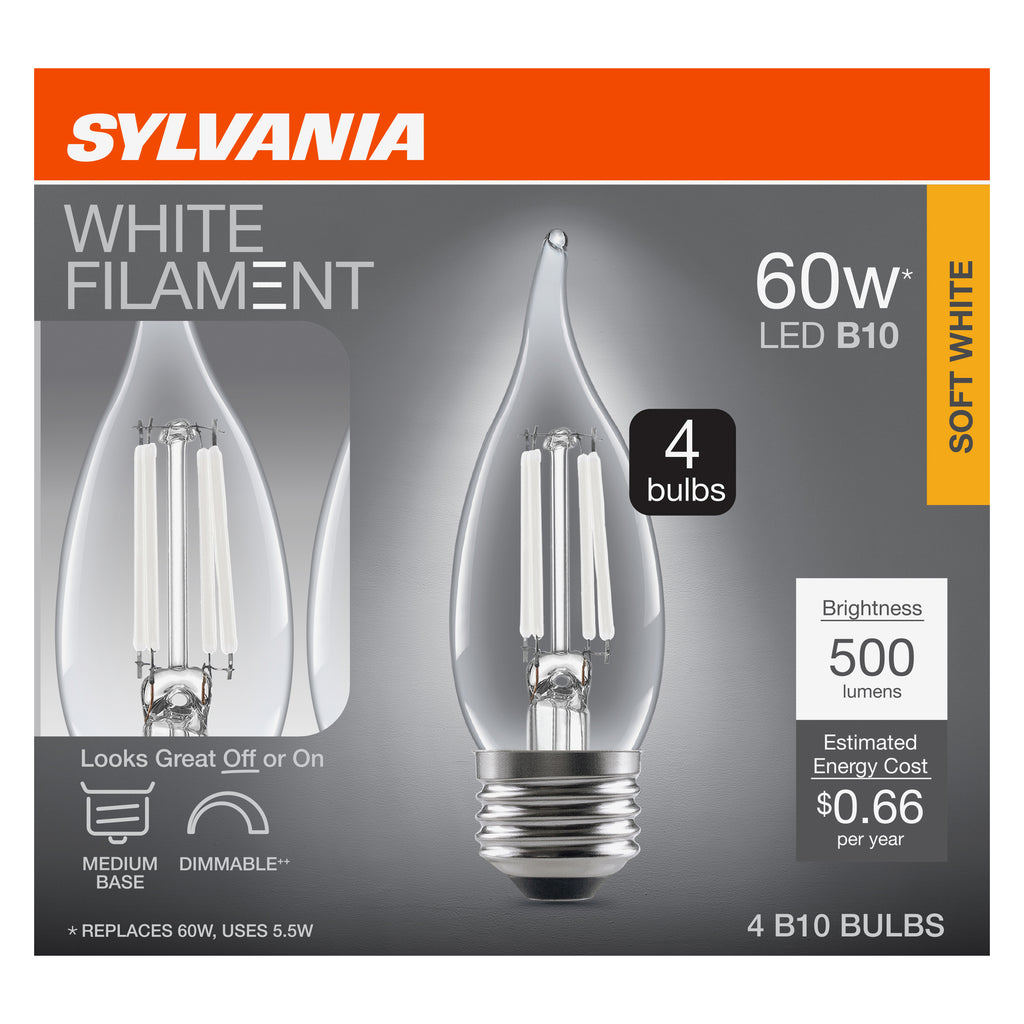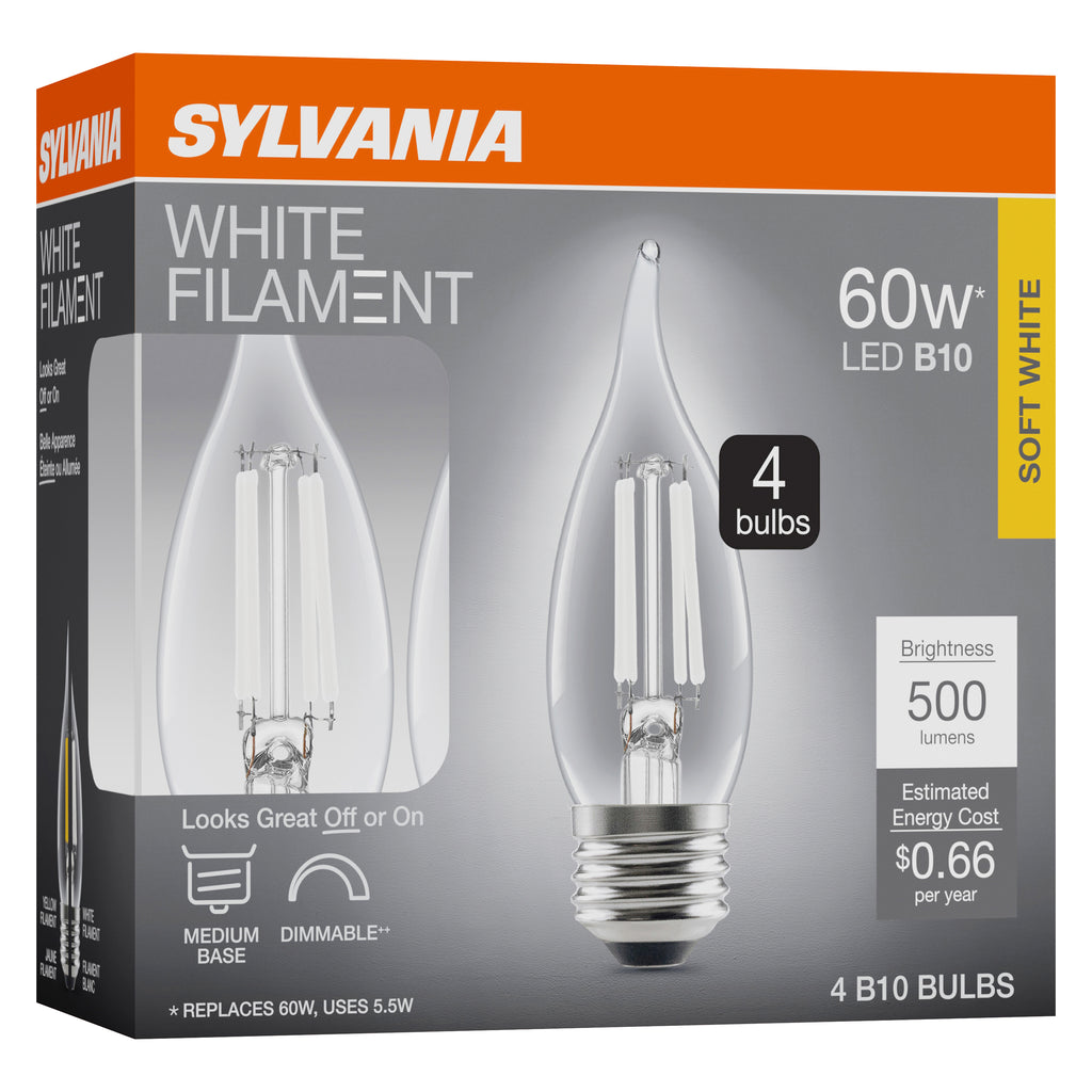 SYLVANIA B10 Clear LED White Filament Bulb, 5.5W, Dimmable, 500 Lms, Medium Base, 2700K, Soft White - 4 PK