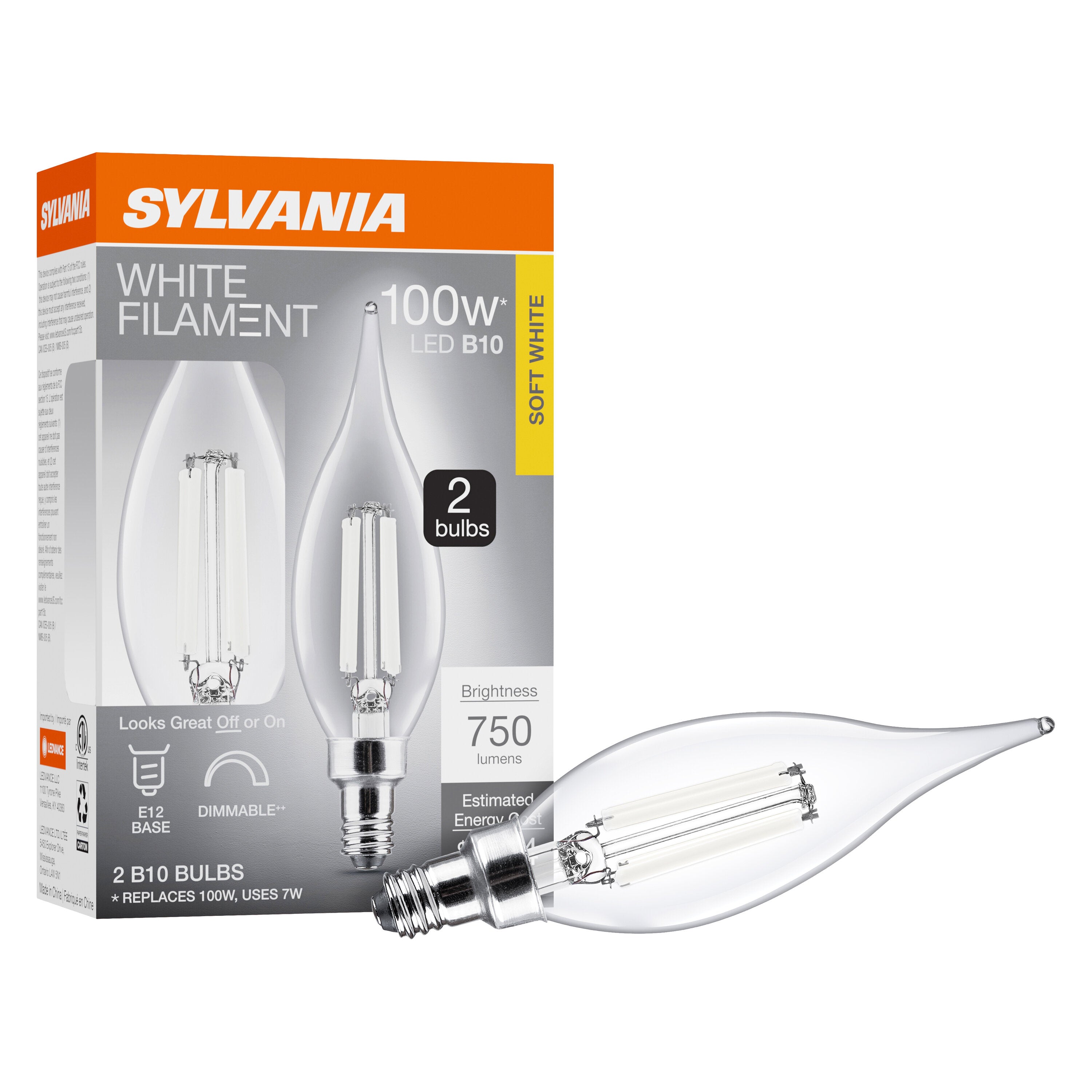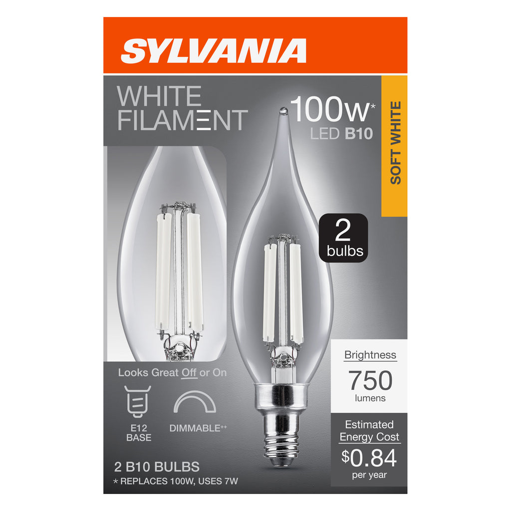SYLVANIA B10 Clear LED White Filament Bulb, 7W, Dimmable, 750 Lms, Candelabra Base, 2700K, Soft White - 2 PK
