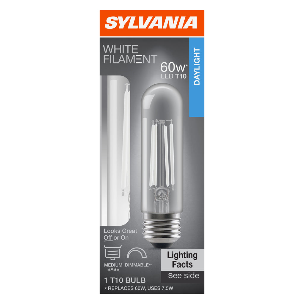 SYLVANIA T10 Clear LED White Filament Bulb, 7.5W, Dimmable, 800 Lms, Medium Base, 5000K, Daylight - 1 PK